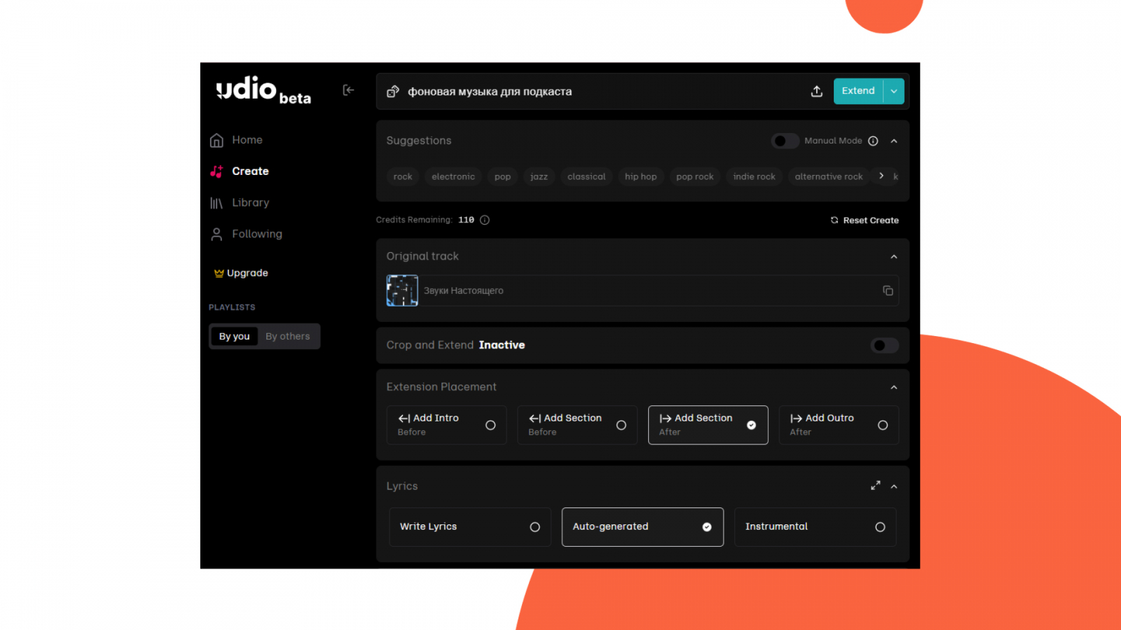 В Udio есть возможно отредактировать или дописать песню (кнопка Extend). Музыкальные фрагменты можно добавлять как в начало песни, так и в конец.