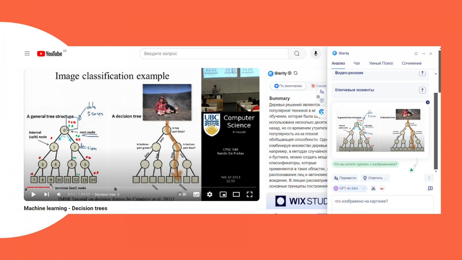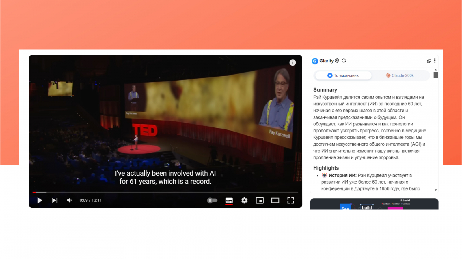 Также есть удобное и многофункциональное расширение Glarity для браузера Chrome, которое помимо суммаризации Youtube-роликов имеет еще кучу функций: