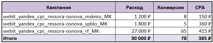 Следуя гипотезе, в Мастере кампаний мы расширили географию на территорию России, вернули Москву и область. Это увеличило количество конверсий и снизило стоимость CPA по оформленному заказу примерно в 3 раза.