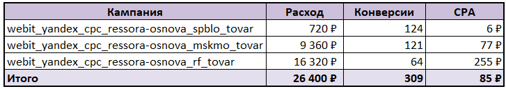 Этот способ помог получить с товарных кампаний 749 целевых конверсий, из которых оформили 82 заказа. Мы перенаправили большую часть бюджета на товарную кампанию на всю РФ, снизив стоимость общего CPA примерно на 55%, а также CPA по оформленному заказу на 62%.