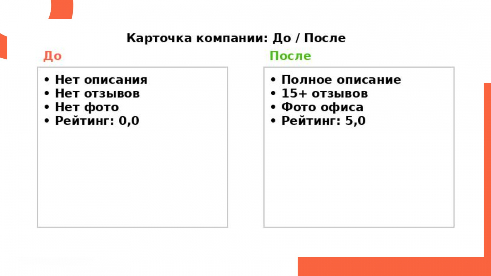 Мы собрали все карточки, созданные ранее (иногда без участия клиента). Добились передачи прав администрирования (без доступа мы не могли внести нужные изменения). И, наконец, добавили описание, фотографии, контактные данные, графики работы, ссылки на сайт.