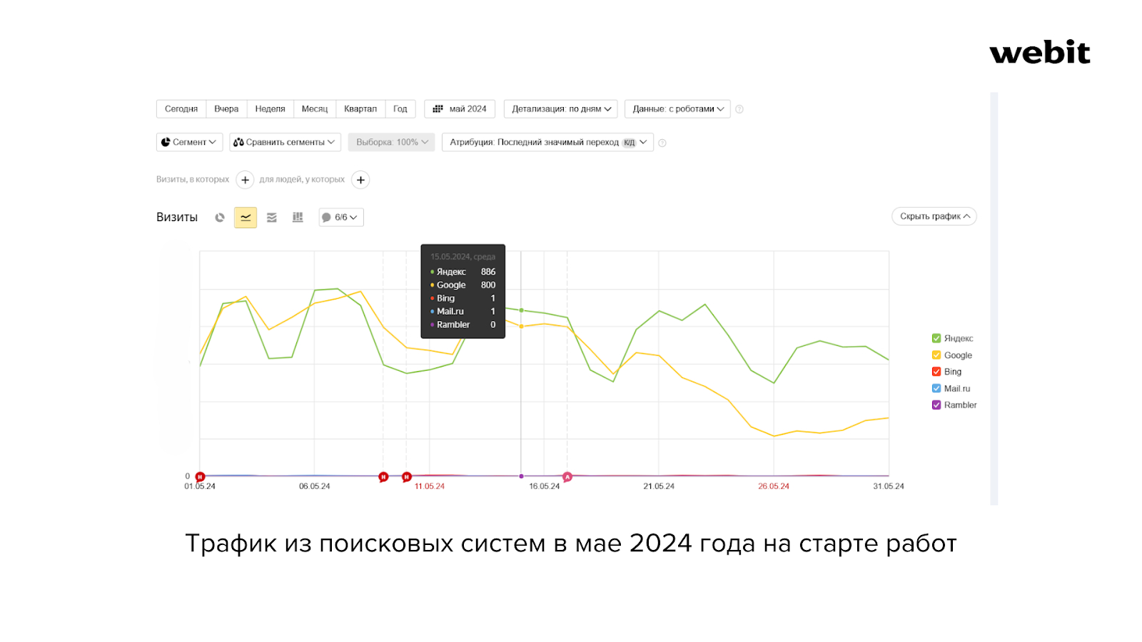 Еще один кейс продавца алкогольной продукции. В мае клиент переехал на новый сайт. Сразу после переезда, трафик из Яндекса немного снизился, а из Google — существенно просел.
