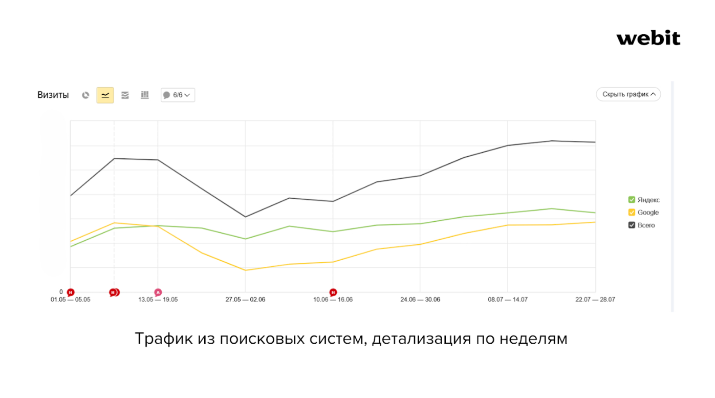 К концу июня проект подхватил SEO-специалист и прекратил просадку. Сайт вернулся к показателям до переезда. С июля начинается рост.