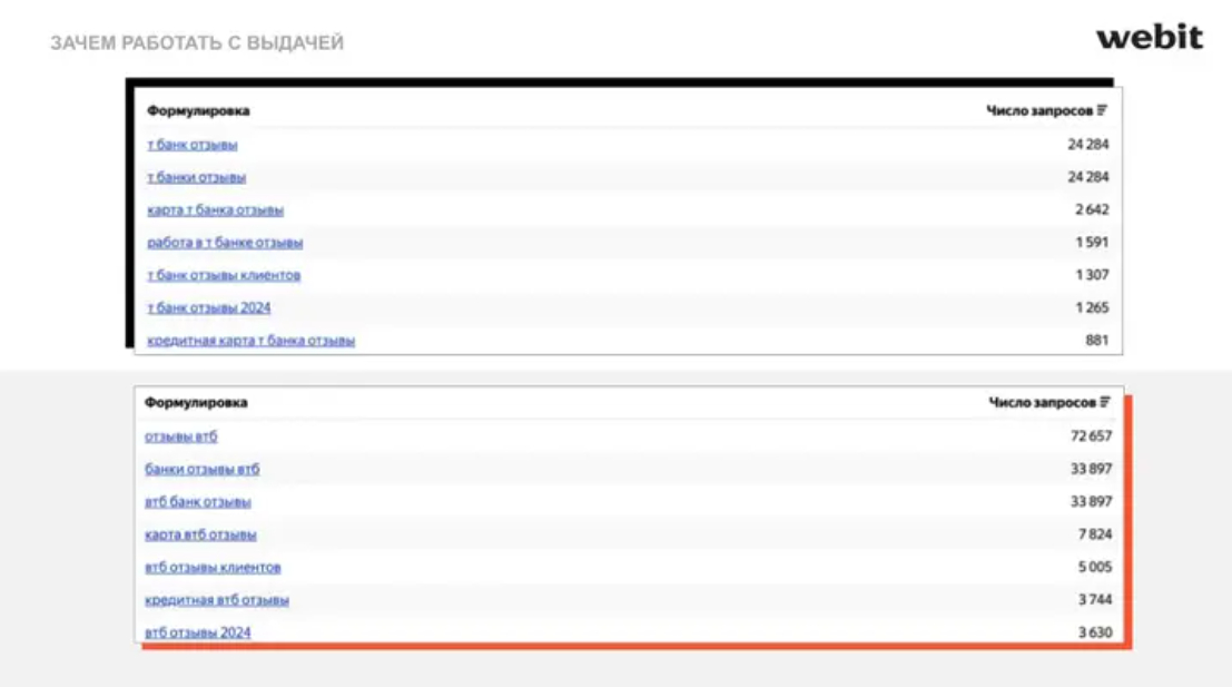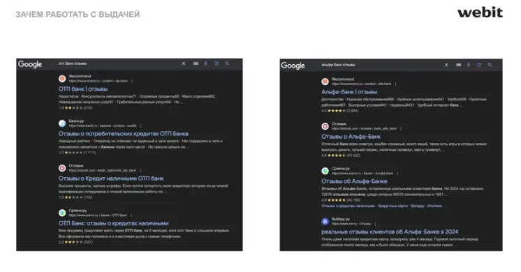 В выдачу могут подтягиваться страницы сайта, и банки показывают именно те отзывы, которые они хотят показать своему потребителю. Многие спорят, что в отзывы на официальном никто не верит и все уже знают, что они ненастоящие. В Webit считают, что лучше все-таки проработать страницы с отзывами. Как минимум, пользователи увидят поменьше негатива, возможного в ТОП-10 выдачи. Для реалистичности картины можно размещать отзывы на 3-4 балла с незначительными минусами.