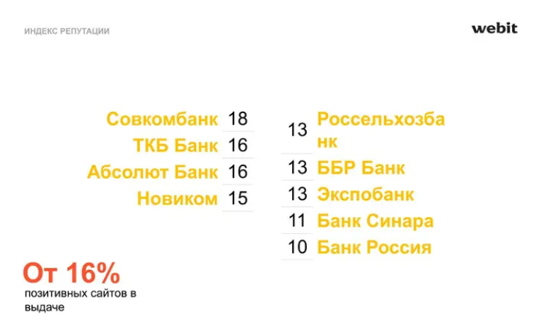 В жёлтой зоне достаточно много банков — в неё попали те, у кого от 16% позитивных сайтов в выдаче.