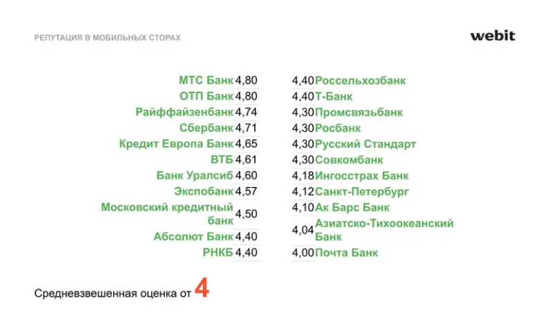 Третья — у банков удалены приложения во многих сторах. Если бы приложения были во всех сторах, как раньше, возможно, зелёная зона была бы меньше, так как было бы больше низких оценок.