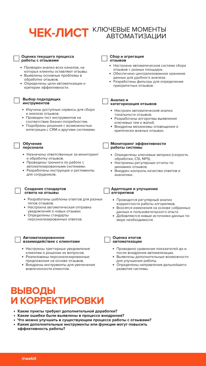 Используйте этот чек-лист для внедрения и совершенствования автоматизации работы с отзывами, чтобы ваш бизнес мог быстрее и качественнее взаимодействовать с клиентами.