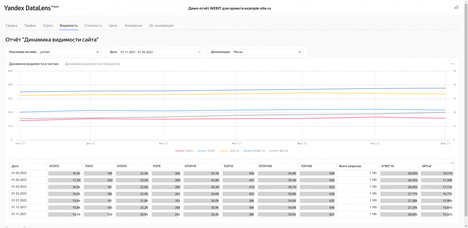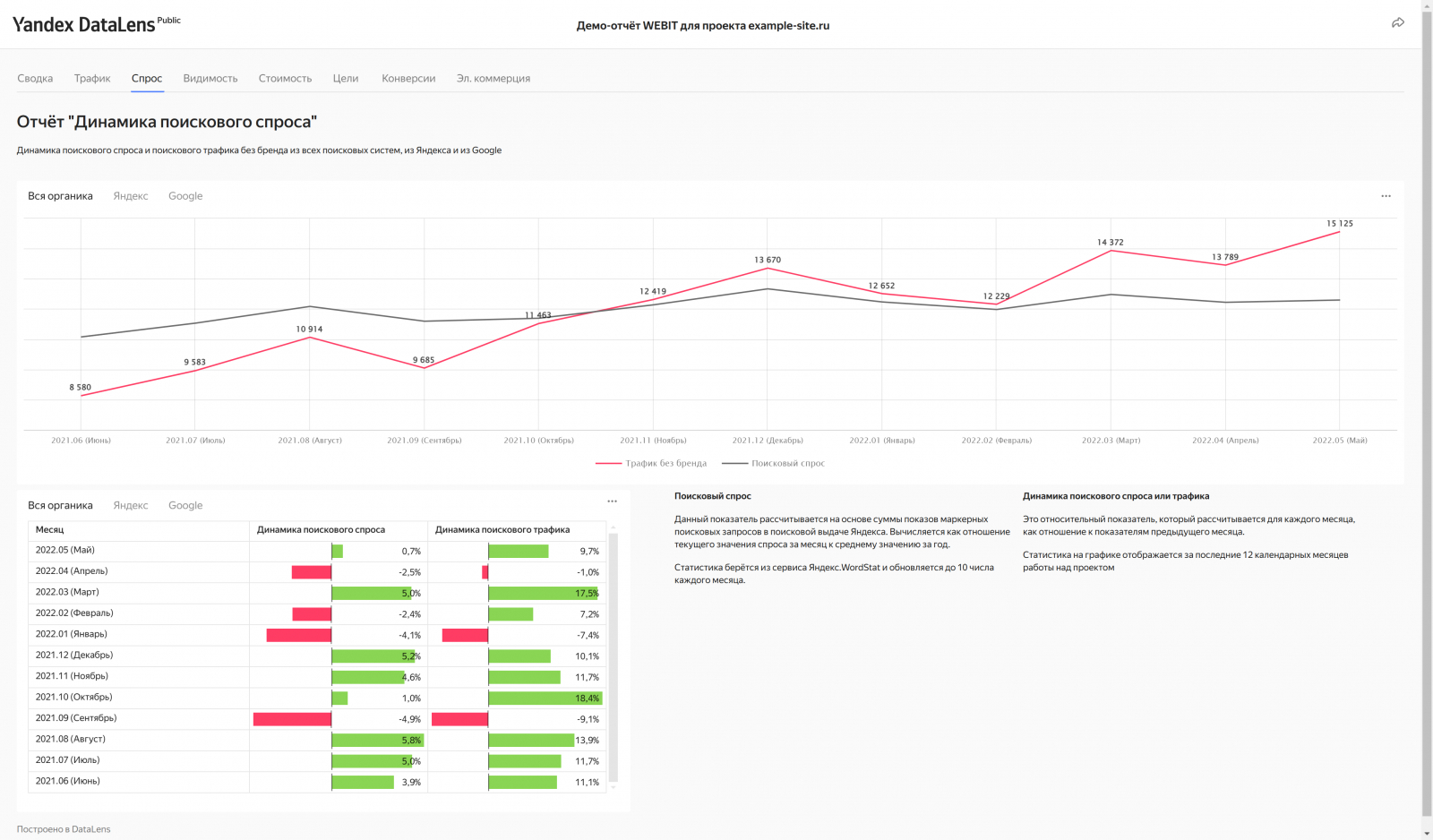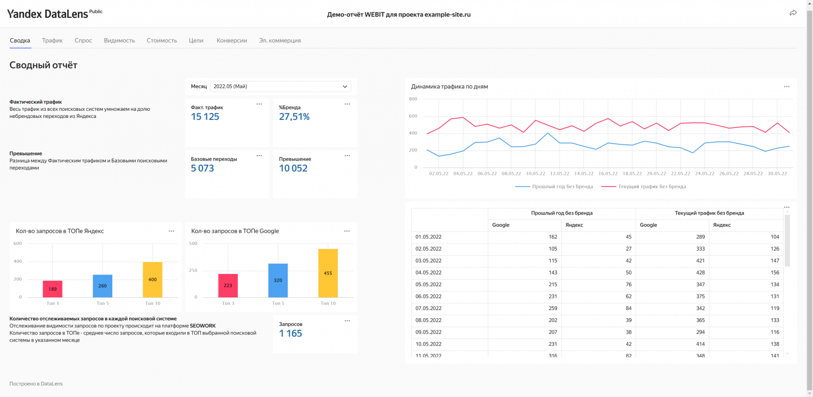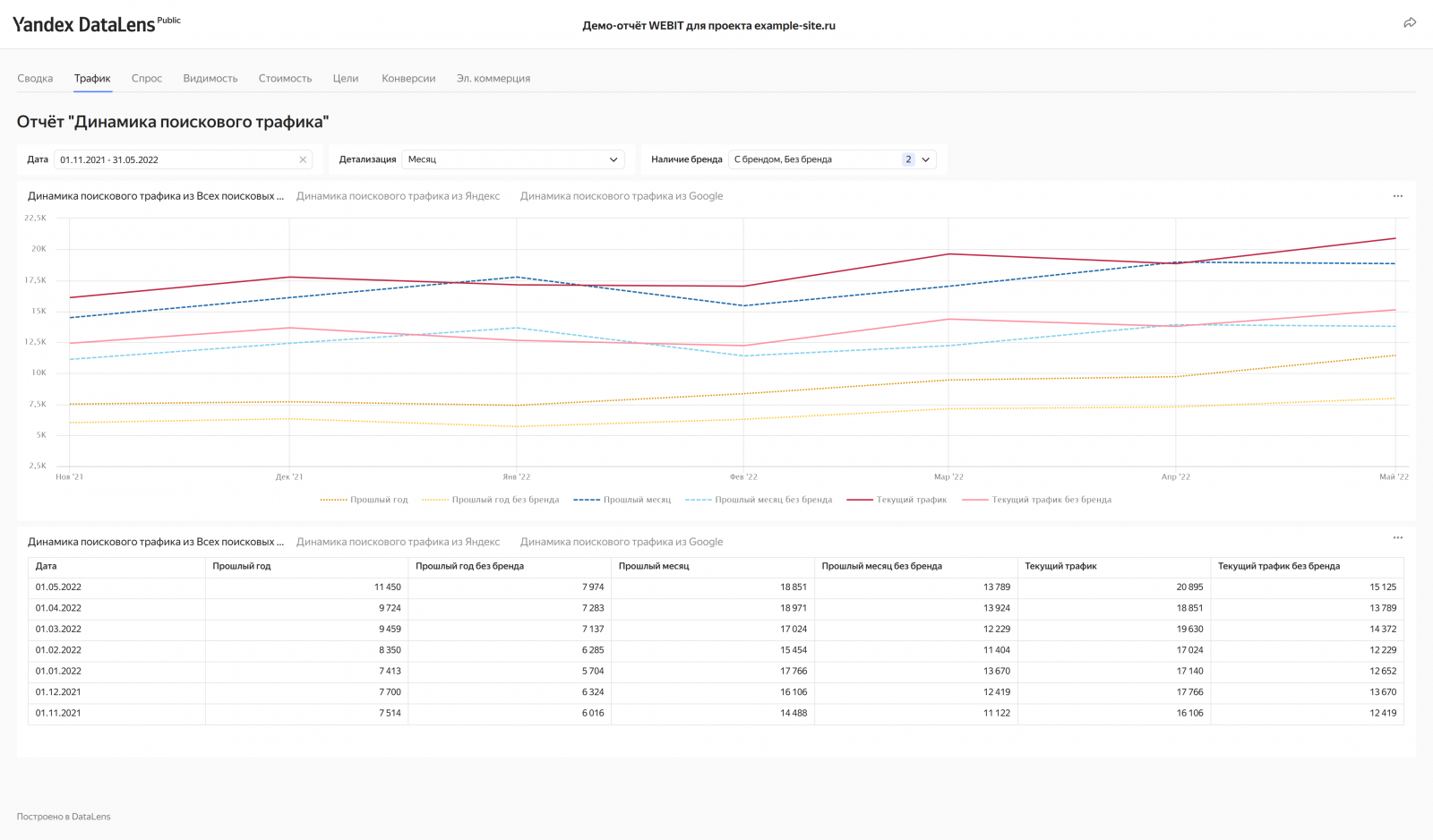 Мы в Webit формируем интерактивные отчеты в Yandex DataLens, куда подтягиваем данные из двух источников: SEOWORK и Яндекс Метрики продвигаемого бренда. Эту форму удобно кастомизировать под потребности любого бизнеса. Интерактивность удобна тем, что можно использовать фильтры и менять временные периоды.
