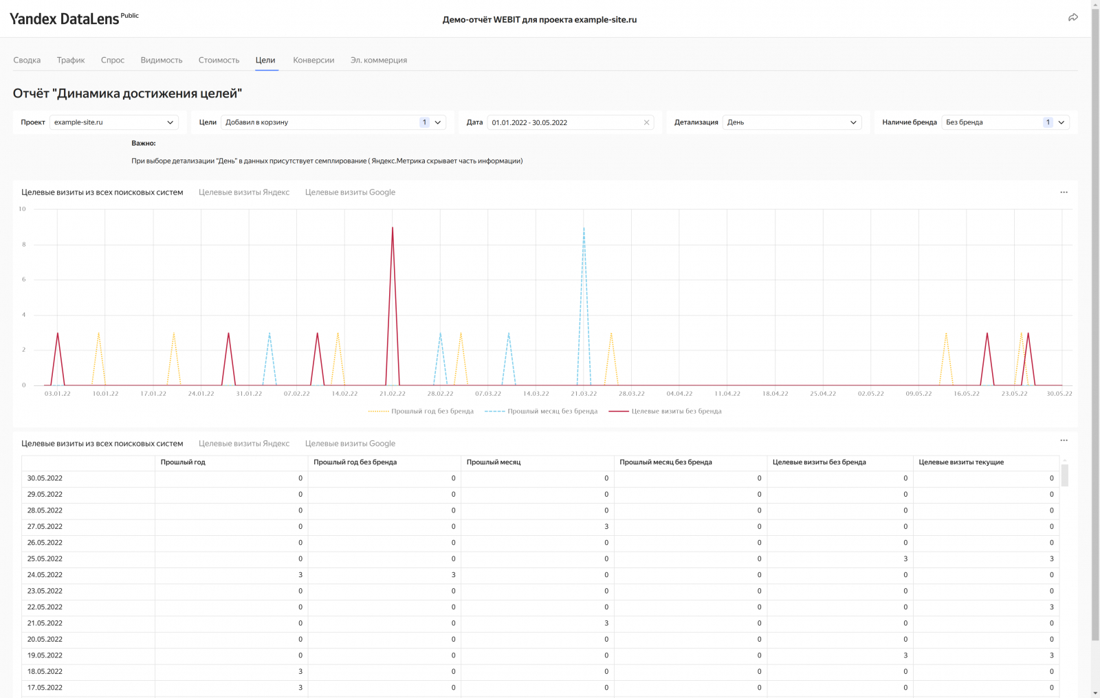 Далее подтягиваем данные по целям, т.е. идем по воронке. Мы отслеживаем и общие, и безбрендовые целевые действия.