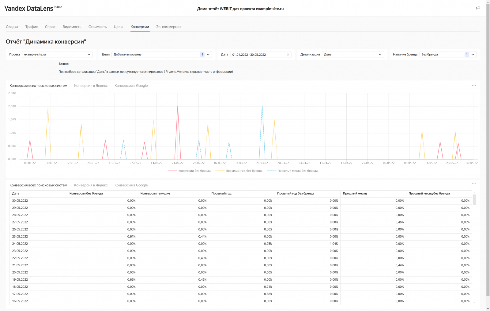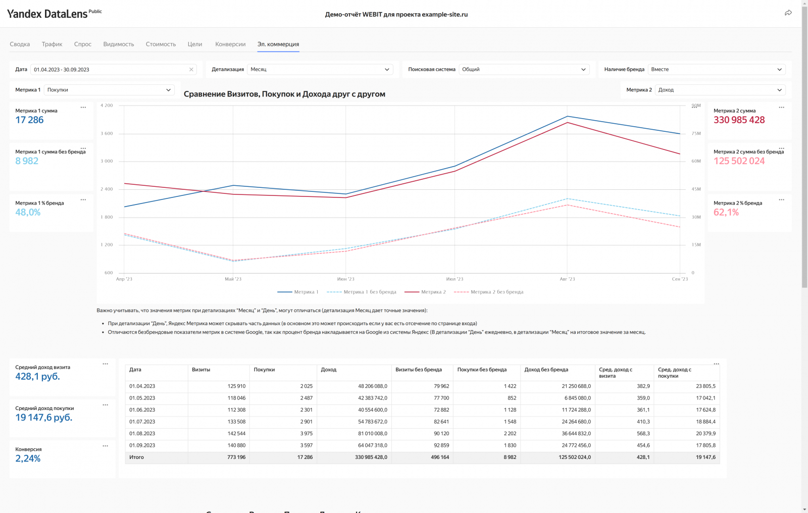 Можно привязать трафик к финансовым показателям и сопоставить, как рост трафика влияет на непосредственный рост выручки. Далее — отследить данные по количеству визитов, покупок, дохода с покупок, и в итоге определить средний доход с визита и средний доход с покупки. Удобно отслеживать безбрендовую и общую конверсию покупок в динамике. Зная эти значения, агентство может перестроить стратегию по продвижению, чтобы приносить бизнесу еще больше пользы.