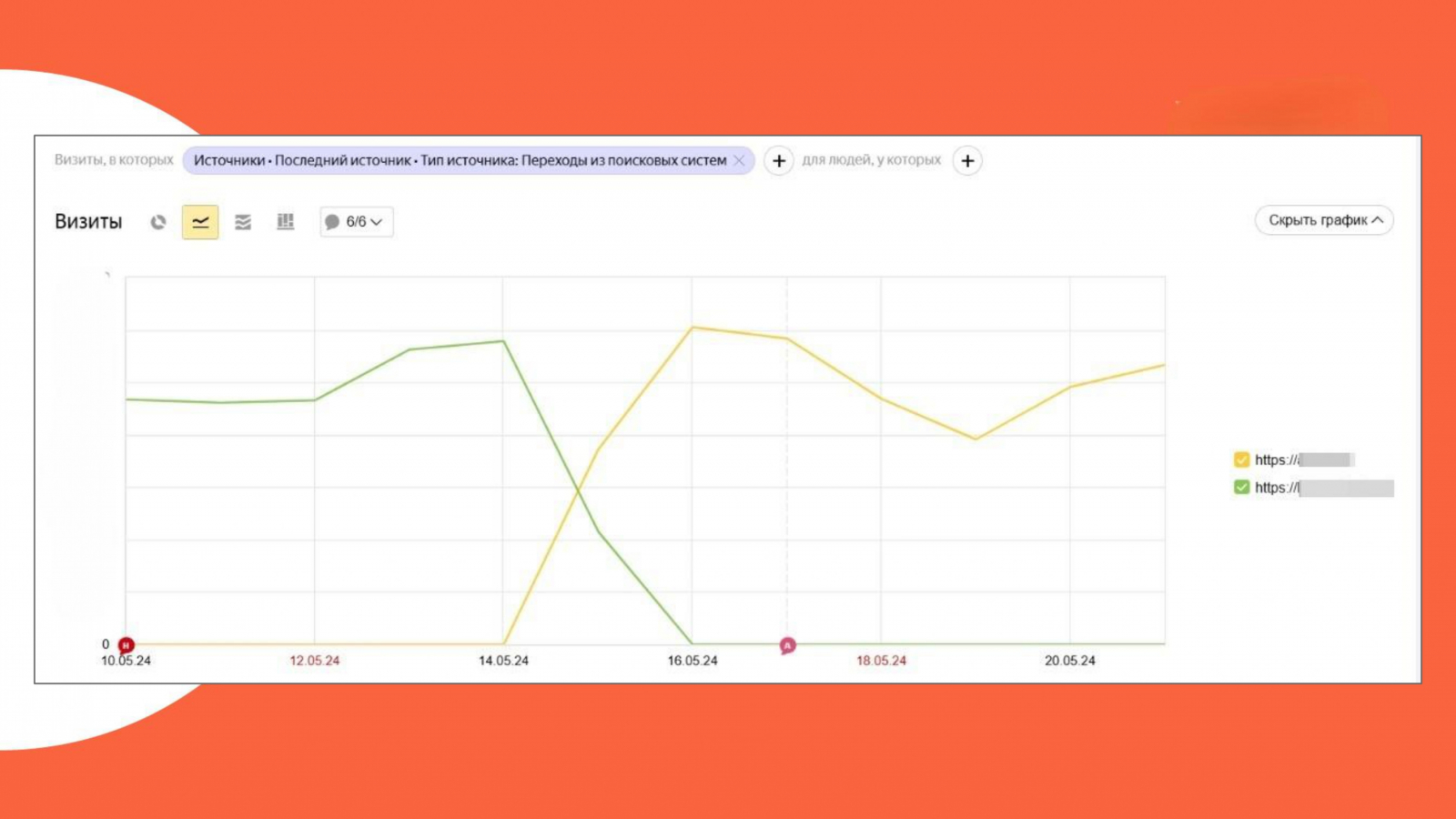 В мае, сразу после переезда, трафик из Яндекса немного снизился, а из Google — существенно просел.