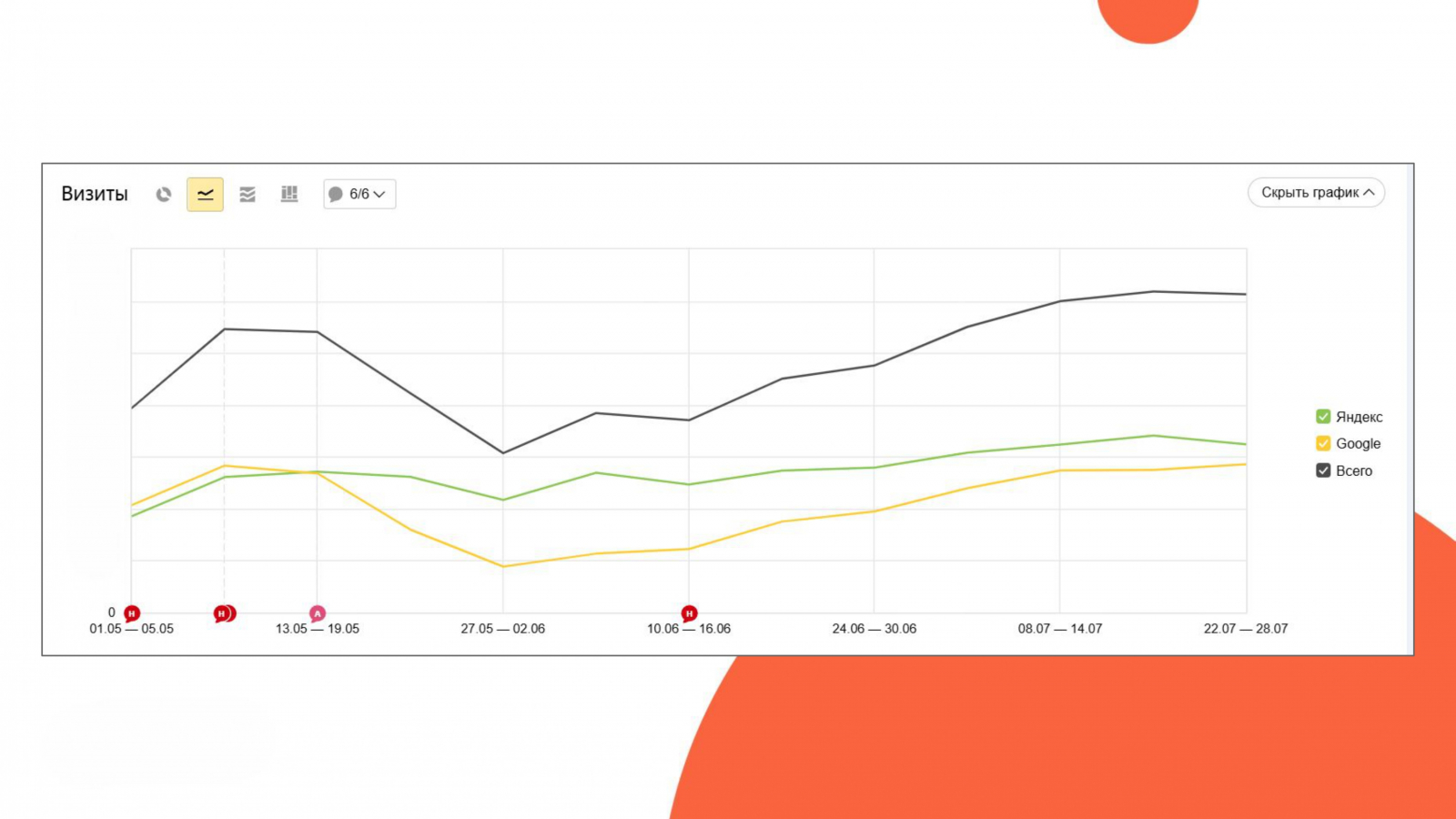 К концу июня мы преодолели просадку, и сайт вернулся к показателям до переезда. С июля начинается рост.