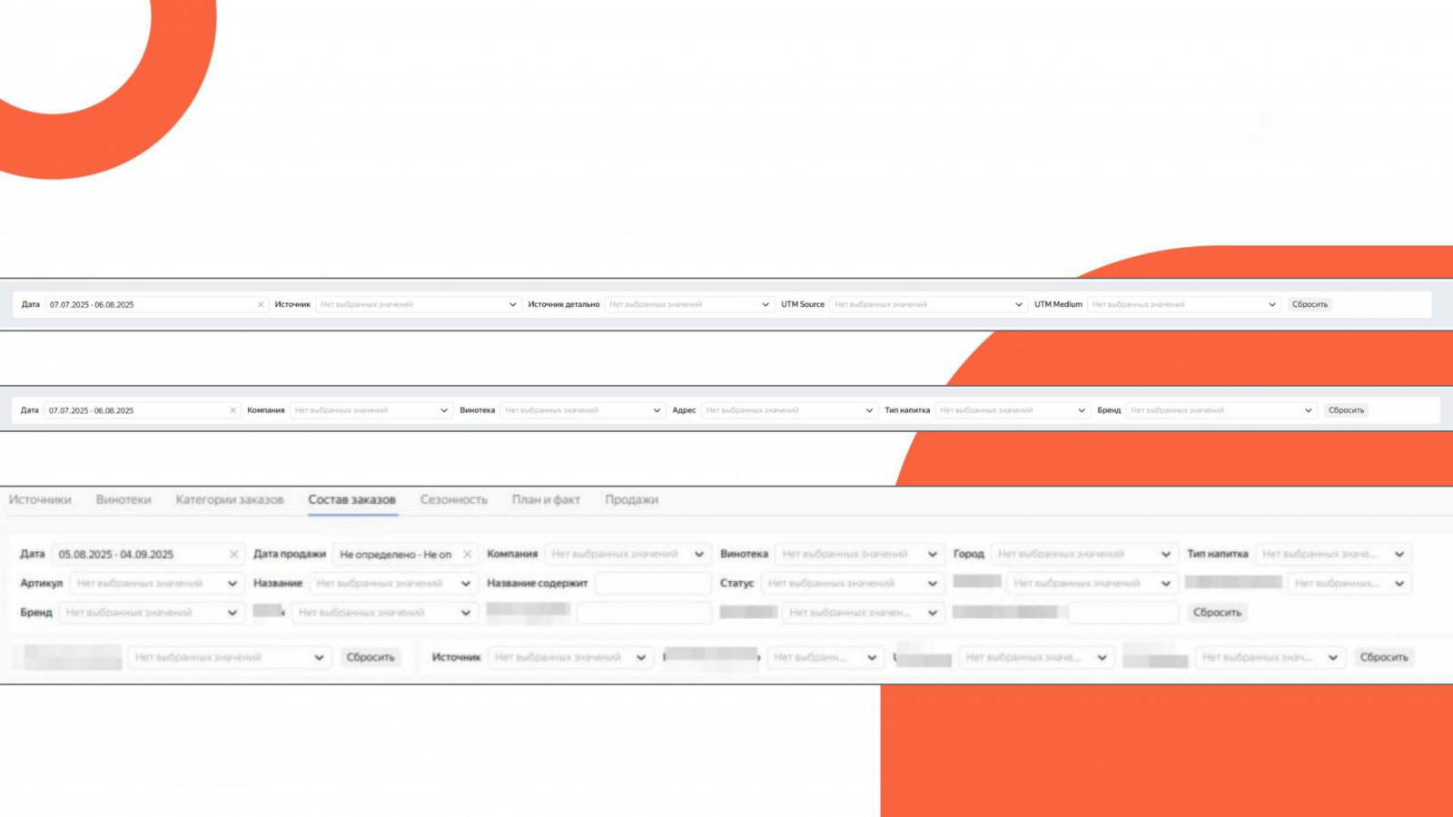 Маркетинг может разрезать данные по дате, винотеке, источнику трафика и сравнить показатели прямо в дашборде, без пересчетов и ожидания отчета.