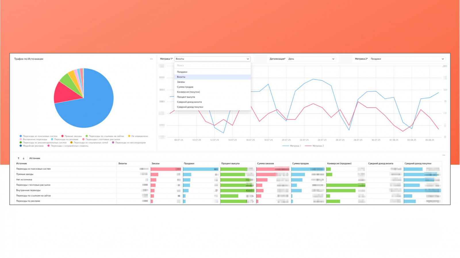 Данные по трафику по источникам — визуализация трафика по различным каналам (органика, платные каналы, социальные сети и реферальные ссылки).