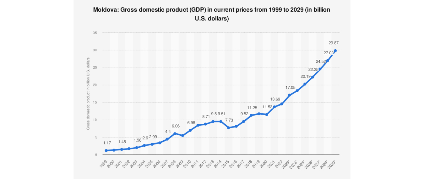 Молдова представляет собой небольшую, но динамично развивающуюся экономику. Страна демонстрирует умеренные темпы роста на фоне проводимых экономических реформ. Основные направления развития включают модернизацию аграрного сектора, повышение уровня промышленного производства и улучшение инфраструктуры. Несмотря на ограниченные природные ресурсы, Молдова наращивает экспорт товаров в страны Европейского Союза и СНГ, используя торговые соглашения и льготные режимы.