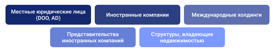 Наиболее часто банки взаимодействуют с компаниями, учрежденными в формате DOO, что является эквивалентом общества с ограниченной ответственностью. Данная форма признана оптимальной с точки зрения соотношения ответственности учредителей и минимальных требований к уставному капиталу. Вторым по популярности является формат AD — акционерное общество, которое может быть как открытым, так и закрытым. В случае с AD открытие счета сопряжено с предоставлением дополнительных данных о структуре капитала и распределении долей среди акционеров.