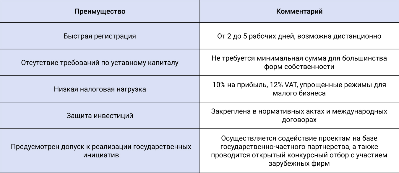 Нерезиденты, решившие зарегистрировать бизнес в Кыргызстане, получают конкурентные преимущества: нулевая ставка налога на дивиденды, единый налоговый счет, автоматическое VAT-возмещение и облегченный доступ к государственным тендерам. Официальный статус иностранного инвестора обеспечивает защиту активов и прозрачность взаимодействия с госорганами.