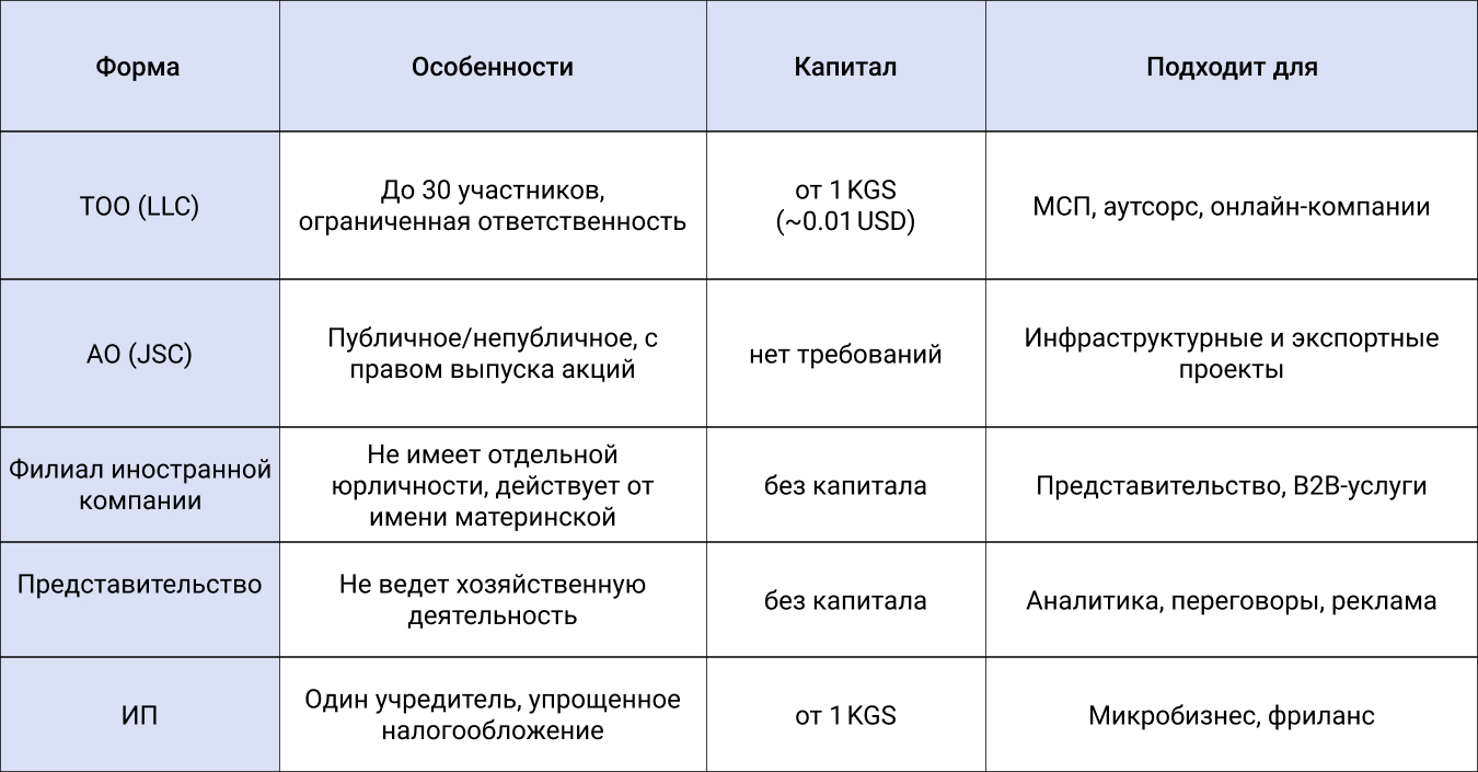 Тем, кто хочет открыть компанию в Кыргызстане, стоит знать: закон предлагает единый реестр организационно-правовых форм. Для каждой предусмотрены свои требования к уставному капиталу, количеству учредителей и корпоративной структуре. При запуске бизнеса в Кыргызстане эти параметры влияют не только на юридическую защиту, но и на доступ к лицензиям, банкам и тендерам.
