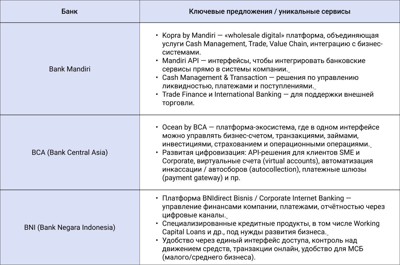 Крупные финансовые организации предоставляют расширенный пакет решений — от лимитов овердрафта до программ финансирования юридических лиц. В Индонезии для бизнеса доступна линейка инструментов: сбор наличных, полисы страхования и сопровождение внешнеторговых соглашений. При более сложной структуре компании набор подключаемых опций, как правило, расширяется.