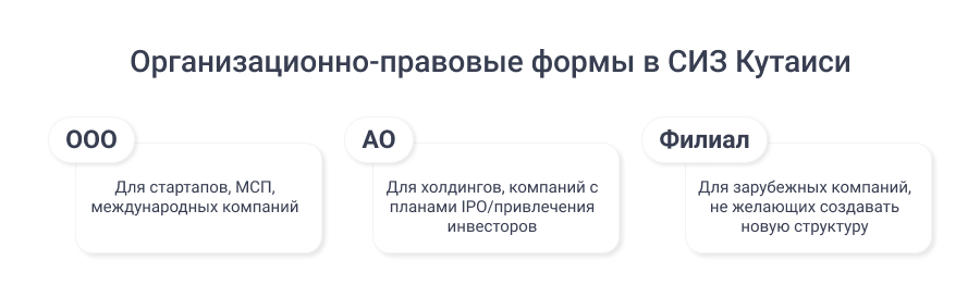 К распространенным вариантом является регистрация нового юридического лица непосредственно в СИЗ Кутаиси. Этот подход обеспечивает компании официальный статус резидента, что открывает полный набор налоговых преимуществ и гарантий. В рамках этого варианта иностранные инвесторы чаще всего выбирают ООО благодаря простой и гибкой структуре, доступной стоимости регистрации и минимальным бюрократическим барьерам.