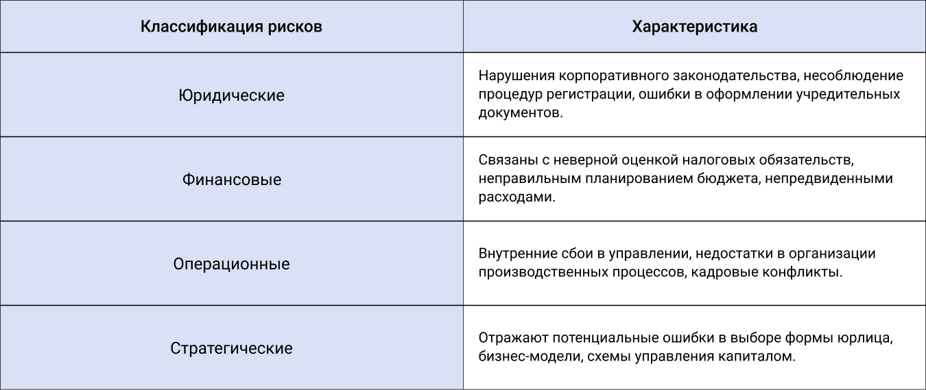 Риски бывают внутренними и внешними. Первые связаны с корпоративным управлением, недостаточной квалификацией персонала, ошибками в бухгалтерском учете и налоговом планировании, нарушением процедур и внутренних регламентов. Другие включают изменения в законодательстве, макроэкономические факторы, колебания валютных курсов и т. д. Идентификация рисков при регистрации предприятия в СИЗ Кутаиси требует системного подхода и анализа всех потенциальных угроз, которые могут возникнуть на различных этапах создания и функционирования фирмы. Они бывают: