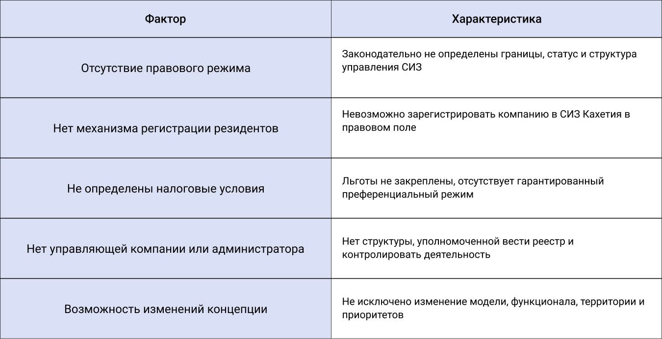 На момент подготовки статьи проект СИЗ Кахетия не имеет утвержденного статуса, что создает определенные правовые и деловые неопределенности. Потенциальные участники должны учитывать риски, связанные с отсутствием нормативной базы и действующего оператора. Ниже представлены ключевые ограничения, которые следует иметь в виду при планировании инвестиций и открытии компании в СИЗ Кахетия.