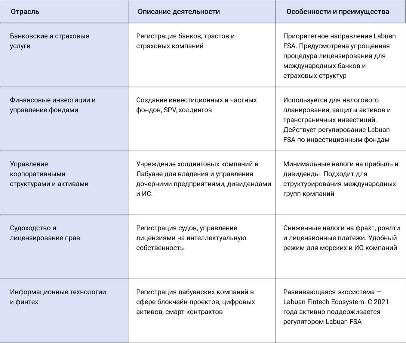Лабуан предлагает особые условия для торговли, инвестиций, страхования, финансовых услуг, управления интеллектуальной собственностью и холдинговых структур. При этом действует упрощенный режим регулирования, который снижает нагрузку на бизнес. Для инвестора или стартапа открытие бизнеса в Лабуане означает экономию ресурсов и получение юридической стабильности. Официальное регулирование осуществляется на английском языке, а управление бизнесом возможно дистанционно, включая открытие корпоративного банковского счета в Лабуане без физического визита.