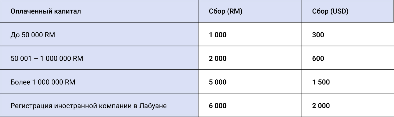Эти сборы уплачиваются при подаче документов на регистрацию компании в Лабуане. Размер зависит от заявленного капитала: