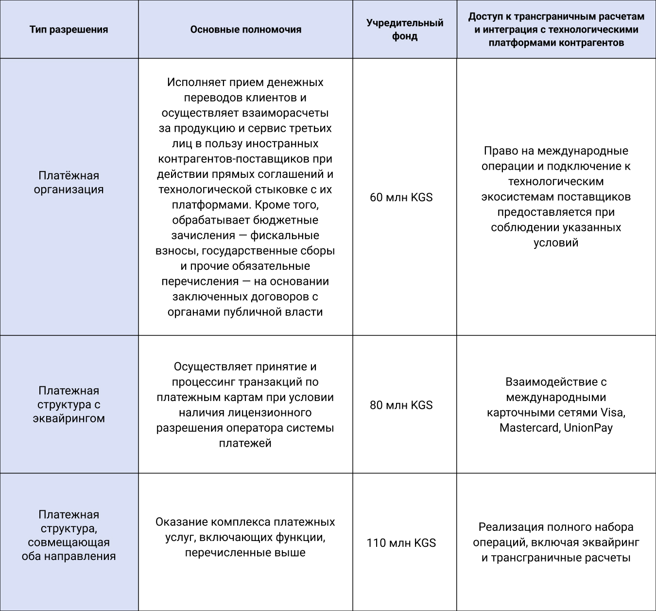 Развитие сектора сопровождается появлением чётких правил, определяющих лицензирование платёжной деятельности в Киргизии и порядок допуска компаний на рынок. Повышенный интерес у бизнеса вызывает возможность учредить собственную расчетную организацию либо оператора системы переводов без банковского статуса.