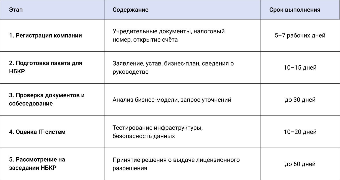 Сколько времени занимает процесс лицензирования?Средний срок составляет от 60 до 90 дней, включая регистрацию компании и рассмотрение заявки НБКР.