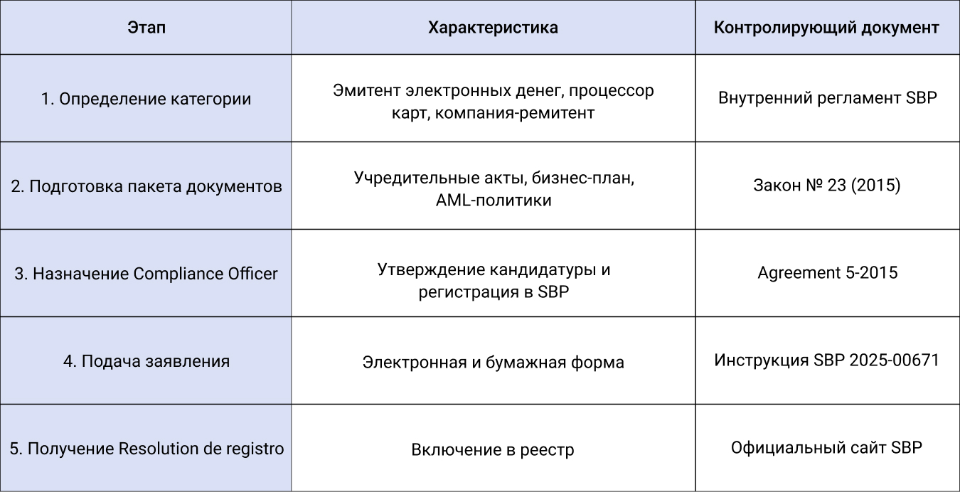 Подача заявления осуществляется в электронном и бумажном виде. Регулятор рассматривает досье в индивидуальном порядке, оценивая прозрачность структуры собственности, деловую репутацию и техническую готовность системы. После проверки SBP выносит Resolution de registro — официальное решение, которое подтверждает право организации вести платёжную деятельность.