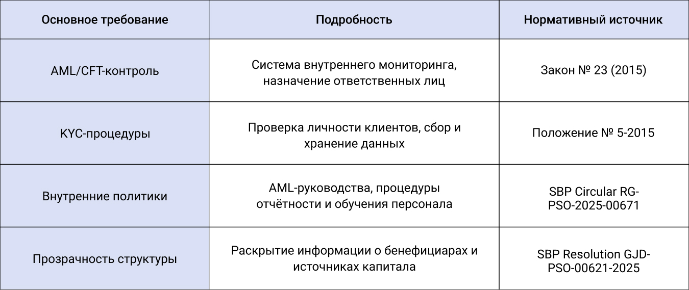Среди базовых параметров выделяются четыре блока, формирующие фундамент для получения разрешения на платежные услуги в Панаме: