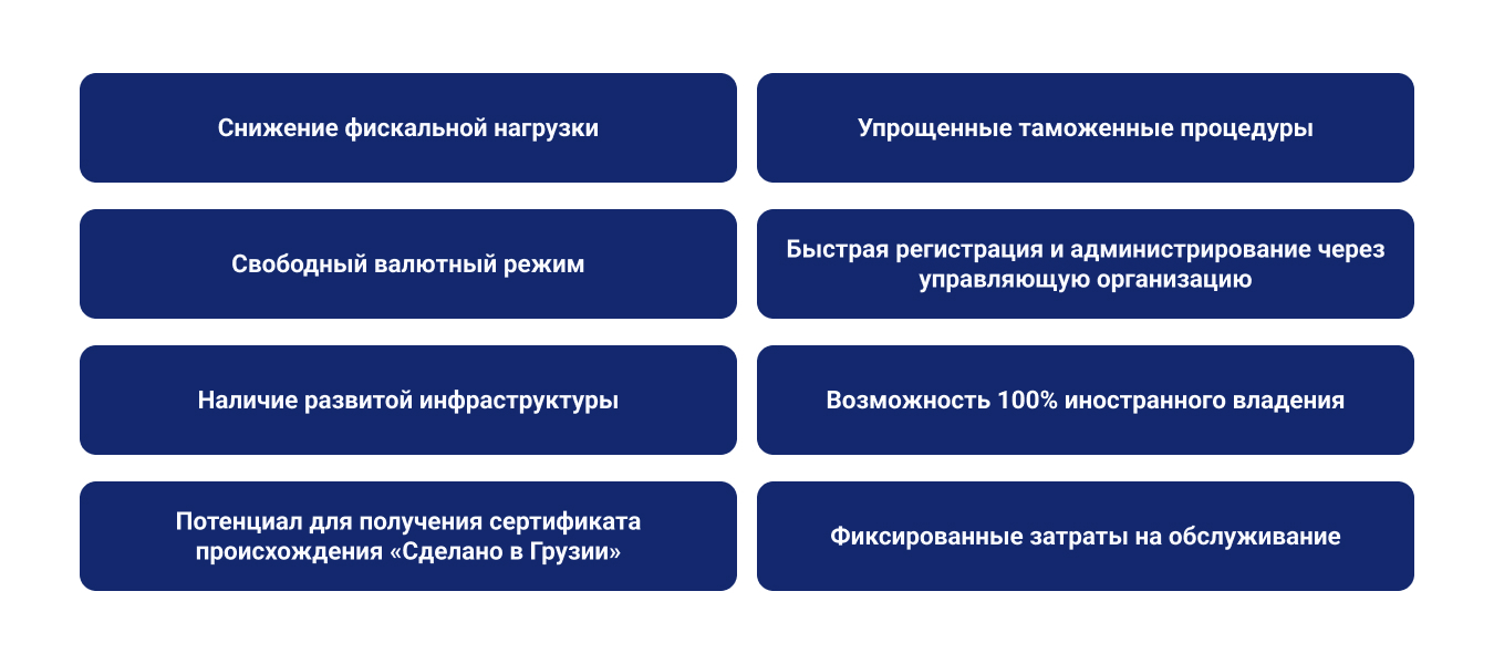 На сегодняшний день в Грузии функционируют несколько территорий с особым режимом, включая Поти, Тбилиси и другие. Каждая из них имеет свою специфику, но «Хуалинг» выделяется масштабами, логистической инфраструктурой и активной ориентацией на иностранный бизнес. Регистрация фирмы в свободной промышленной зоне Кутаиси дает возможность получить освобождение от КПН, НДС и налога на имущество, а также использовать таможенный режим, приближенный к складу временного хранения с возможностью трансформации продукции внутри территории.