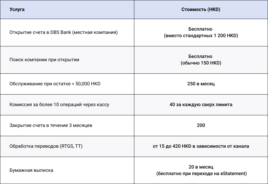 В таблице указаны ключевые возможности, которые доступны при открытии банковского счета на гонконгскую компанию: