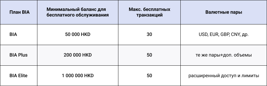Условия обслуживания счета в BOCHK (сравнение BIA):
