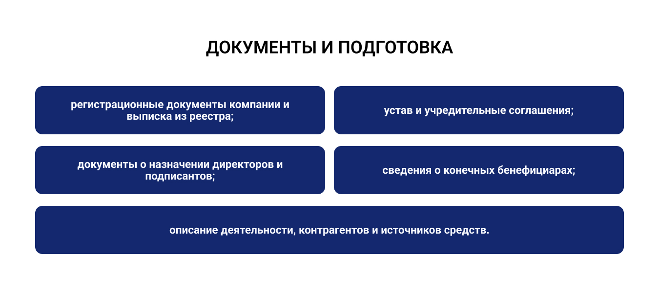 Банк оценивает документы в совокупности, а не по отдельности. Устав, структура владения и анкета клиента должны логически дополнять друг друга и отражать одну модель бизнеса.