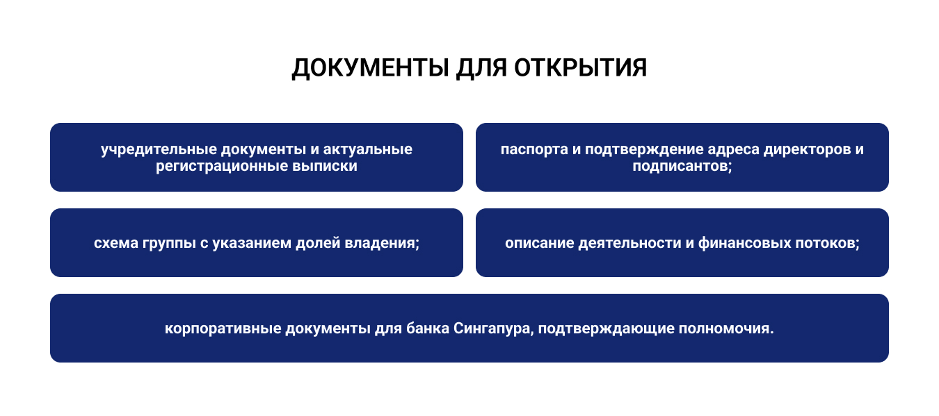 При сложной структуре группы, участии иностранных холдингов или планируемых трансграничных потоках часто требуется сопровождение открытия счета в Сингапуре. Оно сводится к управлению коммуникацией с банком, подготовке пояснительных материалов и контролю согласованности информации во всех документах. Такой формат снижает число повторных запросов и сокращает паузы, которые возникают при возврате пакета на доработку.