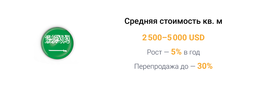 Столица Рияд является не только административным центром, но и ведущим деловым и культурным узлом, благодаря чему ее привлекательность среди покупателей жилья и инвесторов неуклонно растет. Джидда пользуется спросом благодаря активной торговой и туристической деятельности. Особый интерес представляет проект Неом — город будущего, по прогнозам, он станет одним из наиболее технологичных мегаполисов мира. Стоимость жилья существенно варьируется: