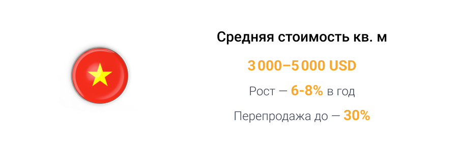 Средний прирост стоимости жилья составляет 5–7% в год, а в престижных районах уровень увеличения цен может достигать 10%. Инвестиции в аренду жилья остаются выгодными — долгосрочная сдача обеспечивает доходность 5–7%, тогда как краткосрочная аренда в популярных туристических зонах, например, Дананг и Нячанг, приносит 8–10% годовых. Средняя цена кв. м в центре Хошимина и Ханоя — 3 000–5 000 USD.