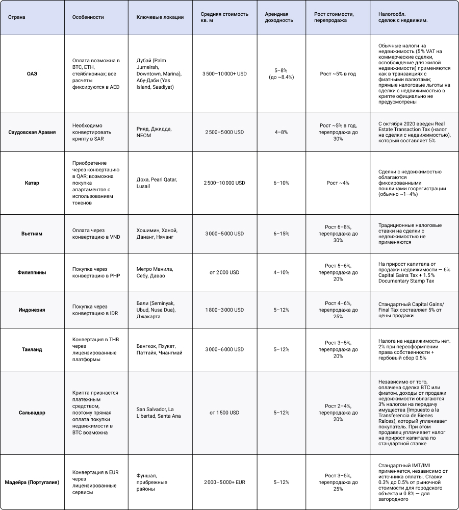 В целом, покупка недвижимости за криптовалюту в большинстве стран реализуется не напрямую, а через обязательную конвертацию в национальную валюту, при этом правовой режим и налогообложение сделок практически не отличаются от классических фиатных операций. Исключением является Сальвадор, где биткоин признан законным платежным средством и возможны прямые расчёты в BTC.
