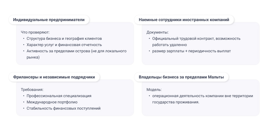 Индивидуальные предприниматели являются одной из ключевых категорий потенциальных участников миграционной программы. При рассмотрении заявлений органы анализируют структуру бизнеса, географию клиентов, характер предоставляемых услуг и финансовую отчетность. Заявитель обязан подтвердить, что основная коммерческая активность осуществляется за пределами острова и не направлена на обслуживание локального рынка. При намерении оформить визу Digital Nomad на Мальте для иностранцев рекомендуется предоставить договоры с международными партнерами, банковские выписки, налоговые декларации страны регистрации и подтверждение регулярного поступления доходов.