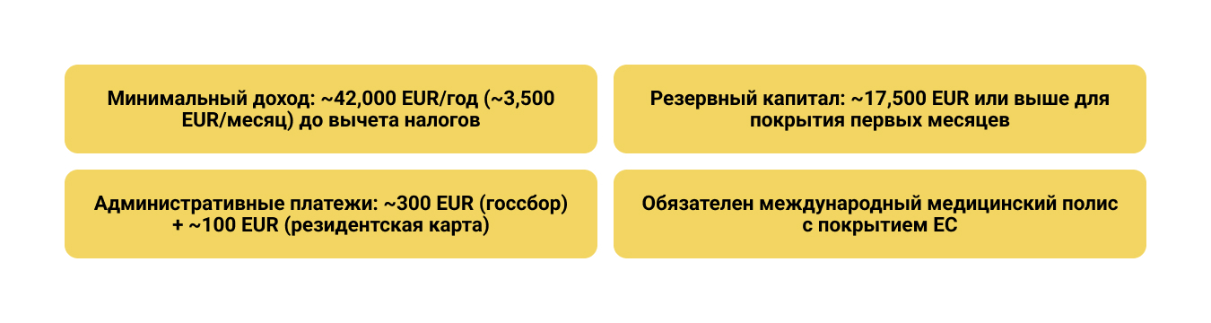 Административные платежи программы включают государственный сбор за обработку заявления в размере около 300 EUR и оплату выпуска резидентской карты приблизительно 100 EUR. Эти платежи являются фиксированными административными расходами и не относятся к финансовым требованиям по доходу. Они подтверждают готовность заявителя участвовать в официальной процедуре миграционного оформления при намерении получить разрешение работать удаленно на Мальте.