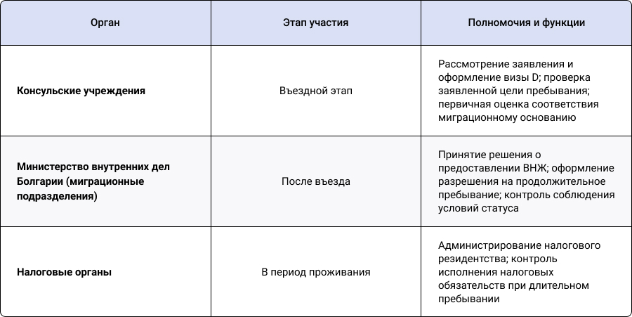 Законодательное регулирование статуса Digital Nomad в Болгарии выстроено по классической модели распределения полномочий между въездным и внутренним администрированием. Это позволяет отделить проверку цели пребывания от контроля фактического проживания и соблюдения условий статуса. Ниже приведена схема ключевых органов и их функций в рамках процедуры:
