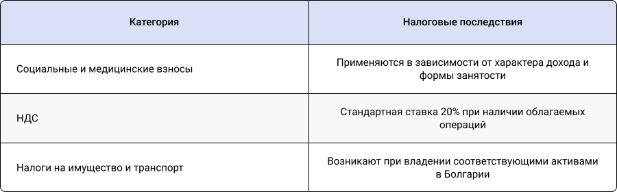 Помимо подоходного налога, в болгарской системе присутствуют и иные обязательства, которые могут затрагивать обладателя статуса Digital Nomad в Болгарии:
