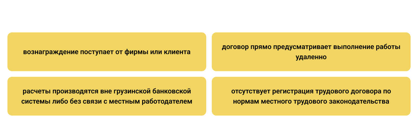 Закон допускает нахождение иностранца при сохранении зарубежного источника заработка и отсутствии интеграции в местный рынок труда. Для получения разрешения для дистанционной работы в Грузии приемлемы следующие характеристики: