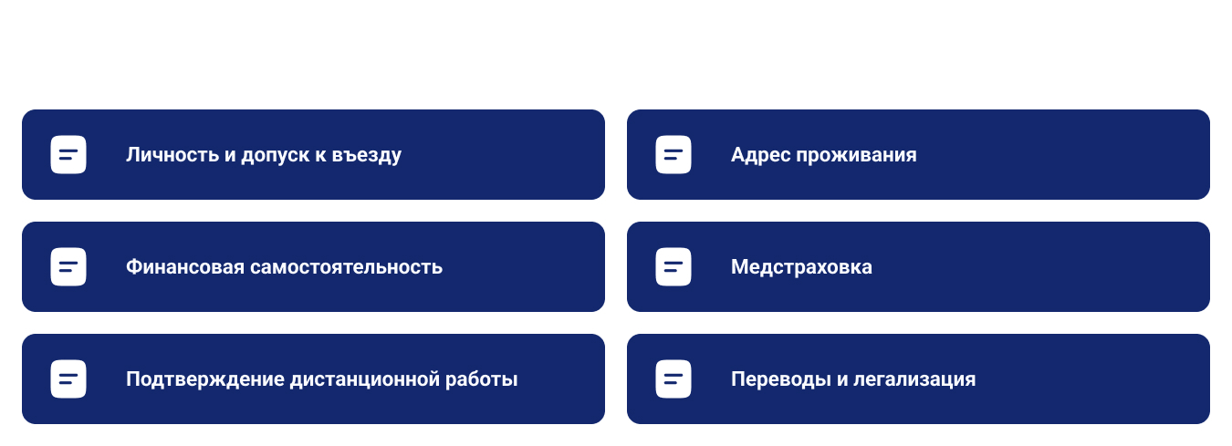 Формируется единый пакет подтверждений, отражающий цель нахождения, зарубежный источник денежных поступлений и финансовую самостоятельность. Согласуются формулировки в договорной документации, банковских выписках и анкете. Проверяется соответствие срока аренды предполагаемой продолжительности нахождения. Выполняется перевод и заверение материалов.