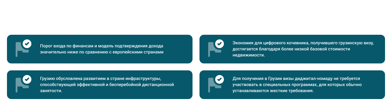 Для получения в Грузии визы диджитал-номаду не требуется участвовать в специальных программах, для которых обычно устанавливаются жесткие требования. Страна предлагает варианты, которые доступны большинству иностранцев. Въехать без визы на срок до года могут граждане порядка 90 государств. Для других есть возможность быстрого и удобного оформления электронного разрешения. Цифровые кочевники, имеющие иммиграционные цели, могут получить визу типа D, а после въезда в страну — податься на ВНЖ.
