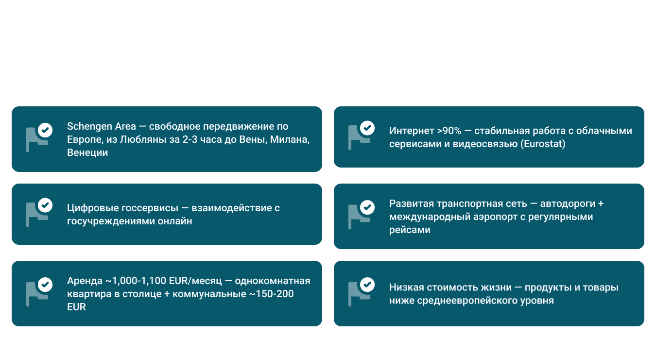 Получить Digital Nomad-визу в Словении означает оформить право легально жить в стране ЕС и Шенгенской зоны, пользоваться ее инфраструктурой без необходимости трудоустройства в местной экономике.