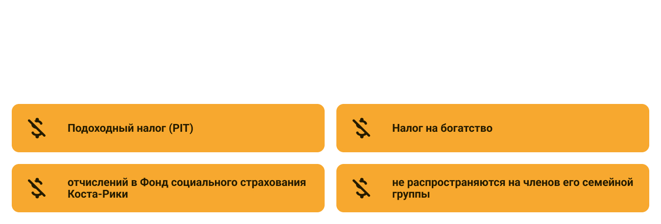 Специальные льготы. Владельцам статуса предоставляется полное освобождение от импортных пошлин и налогов на ввоз инструментов и оборудования, необходимых для выполнения профессиональных задач. Кроме того, налоги для цифровых кочевников в Коста-Рике на доходы из иностранных источников отсутствуют, что существенно повышает покупательную способность специалиста.