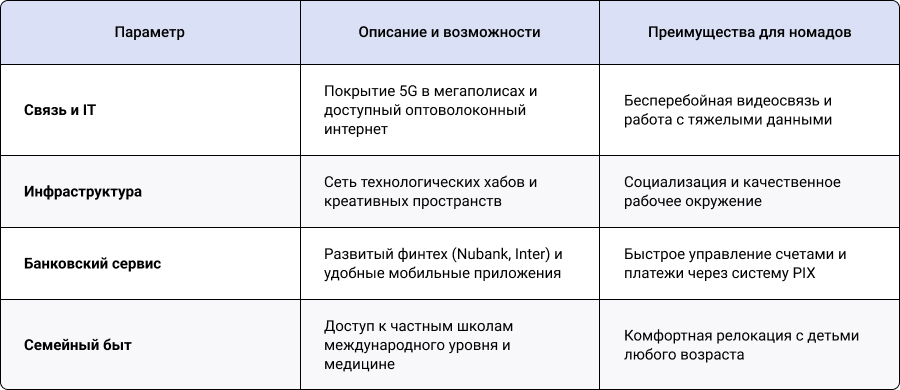 Выбор южноамериканского направления для долгосрочного нахождения обеспечивает специалистам интеграцию в уникальную среду и гарантирует легальное положение в развивающемся экономическом центре. Чтобы сочетать мобильность и карьерные возможности, специалисты решают получить Digital Nomad-визу в Бразилии. Местное законодательство сфокусировано на создании благоприятных условий для технологических экспертов. Оформление миграционного кейса под контролем профильных аналитиков минимизирует риски возникновения административных барьеров. Нахождение под экспертным кураторством гарантирует предсказуемый результат и позволяет получить бразильское Digital Nomad-разрешение в кратчайшие сроки без избыточной нагрузки на заявителя.